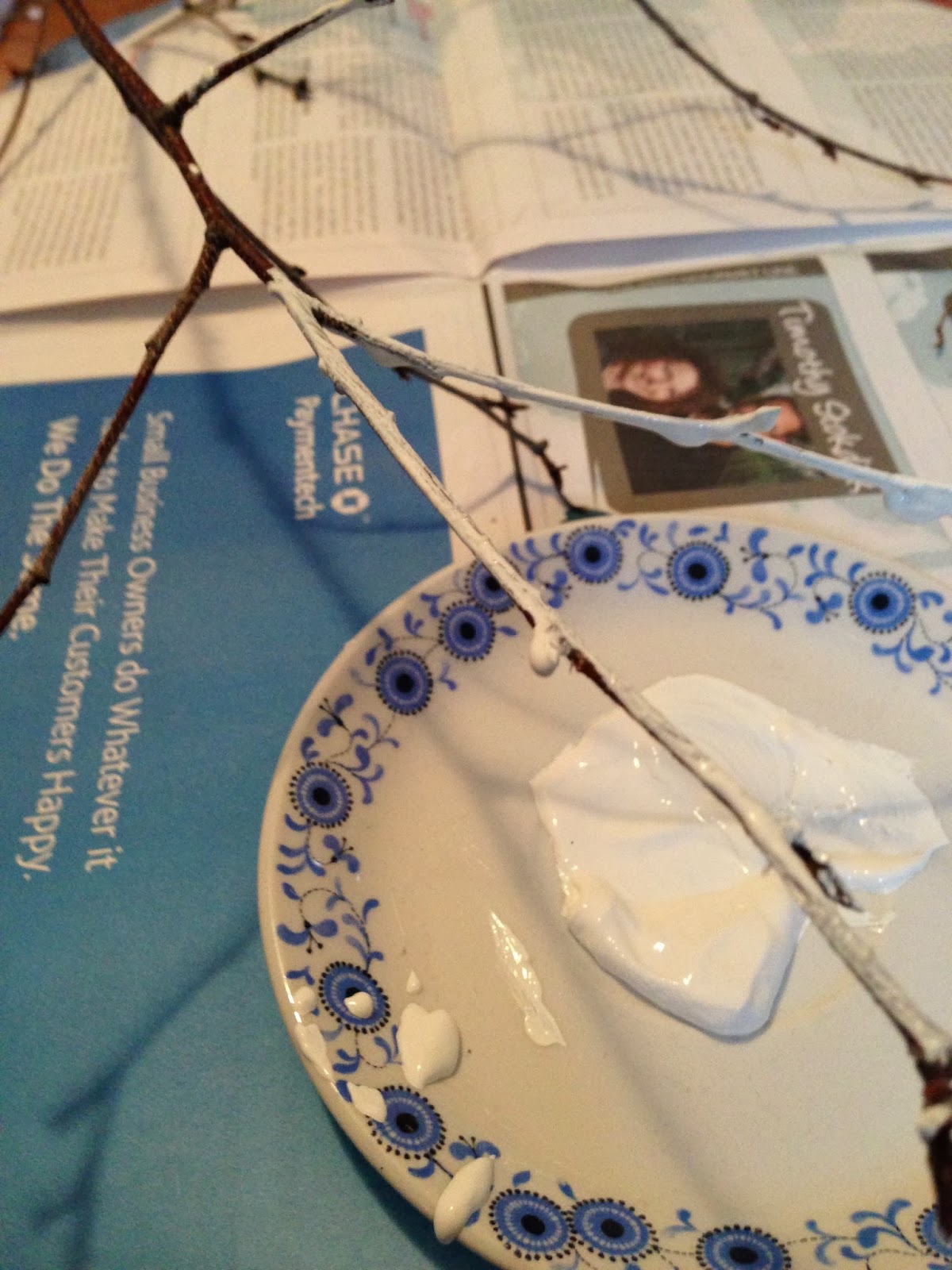 After taking the leaves off of the branch, you can begin painting the branch white.  The paint goes on smoothly.  I started from the tips of the branch then finished at the thickest part of the branch I found it easier this way.  Once the branch is fully painted you can let it air dry on a newspaper.